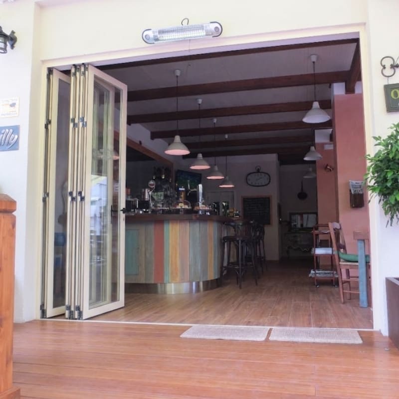 Puertas plegables en las que varias hojas se deslizan y se pliegan hacia un lado, dejando casi todo el vano libre.