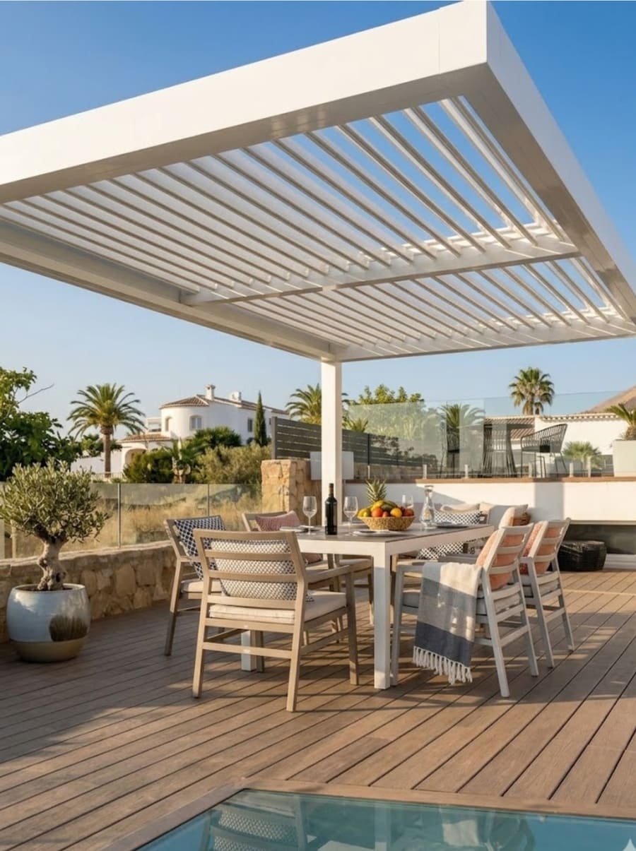Las instalamos en cualquier espacio exterior, como terrazas, jardines, patios o piscinas. Las lamas orientables de la pérgola bioclimática permiten regular la entrada de luz solar y crear un ambiente más agradable y confortable, tanto en verano como en invierno.
